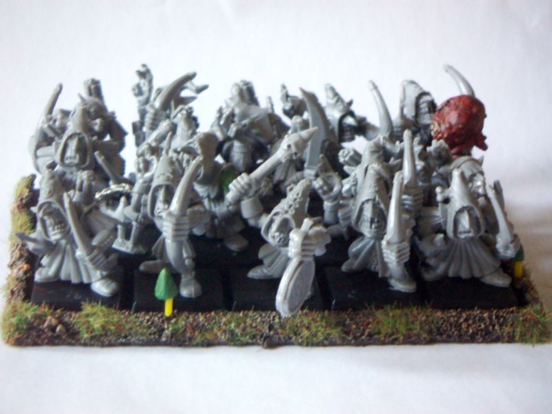 This unit represents my new hobby project, which is going to be about building a Night Goblin Clan to join my Orcs & Goblins army. I never liked the models that were released with the 7th edition of Warhammer, as the goblins there look so tiny and lacking in character, that I decided on getting a hold of the Night Goblin miniatures of the previous edition. I believe these display far more goblin characteristics, in particular the faces, and I also like how they measure up next to their normal goblin kin.With these I wanted to accomplish a couple of things. First of all to tie the unit together with the other goblin units I'm running as far as them being subject to mild animosity. Secondly, I wanted to make a stronger attempt at portraying motion with my conversions, by having the models interact with each other across bases (not just within the models on the same diorama). Thirdly, I hoped to capture the spirit of Night Goblins by introducing elements typical to them, such as squigs and fanatics.